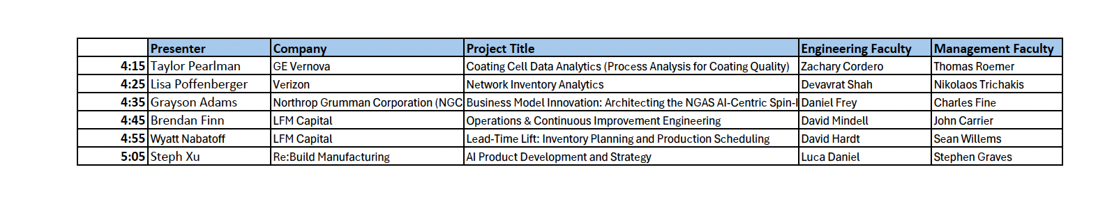 The program office will be reaching out to students, company supervisors, and faculty for scheduling conflicts before assigning students to session slots.